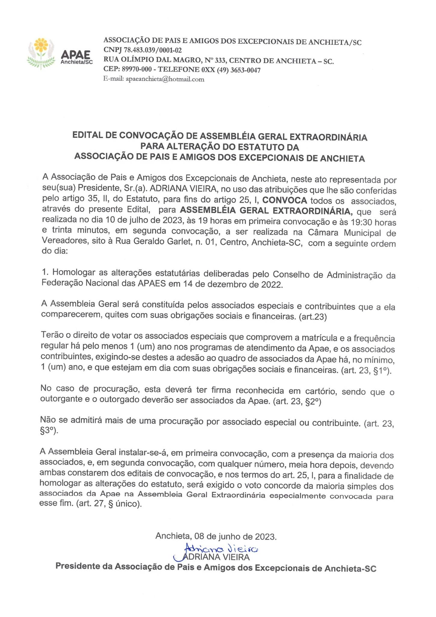 EDITAL DE CONVOCAÇÃO DE ASSEMBLÉIA EXTRAORDINÁRIA PARA ALTERAÇÃO DO ESTATUTO DA ASSOCIAÇÃO DE PAIS E AMIGOS DOS EXCEPCIONAIS DE ANCHIETA - Apae Anchieta -> SERÁ REALIZADA NO DIA 10 DE JULHO DE 2023 ÀS 19H NA CÂMARA MUNICIPAL DE VEREADORES.